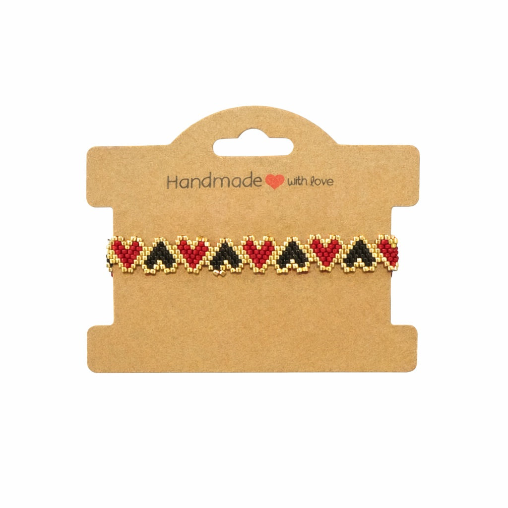 A beautifully handcrafted bracelet featuring delicate red and black hearts outlined in shimmering gold details.